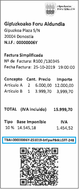 Ejemplo del aspecto final de un Ticket generado bajo la normativa del sistema TicketBAI.